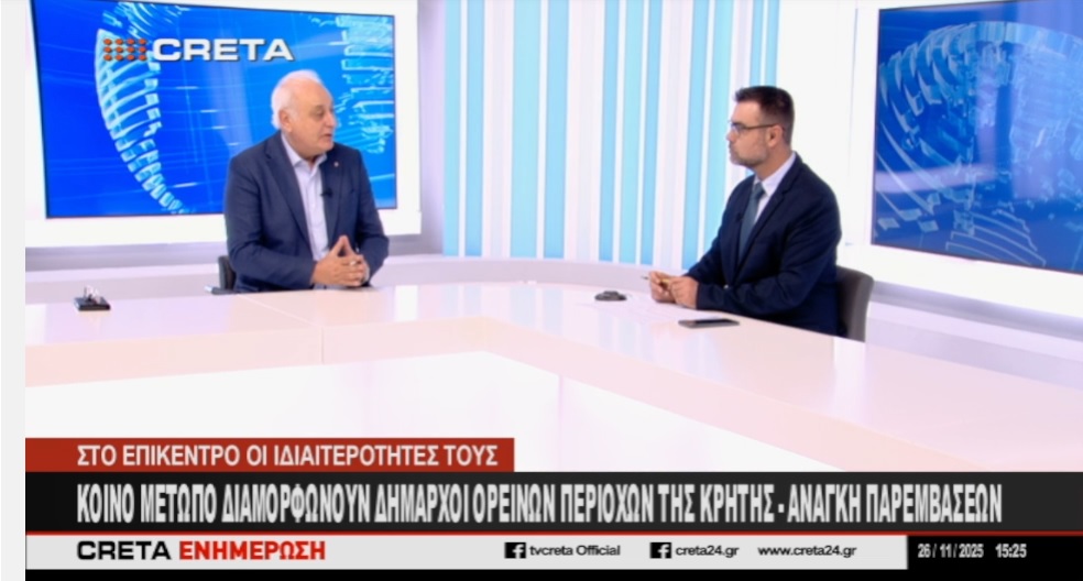Kαλεσμένος στην ΚΡΗΤΗ TV στην απογευματινή εκπομπή «ΚΡΗΤΗ ΣΗΜΕΡΑ» του καναλιού με την δημοσιογράφο Νικολέττα Σφακιανάκη, όπου συζητήσαμε για τα τρέχοντα θέματα και τα προβλήματα των Ορεινών Δήμων.