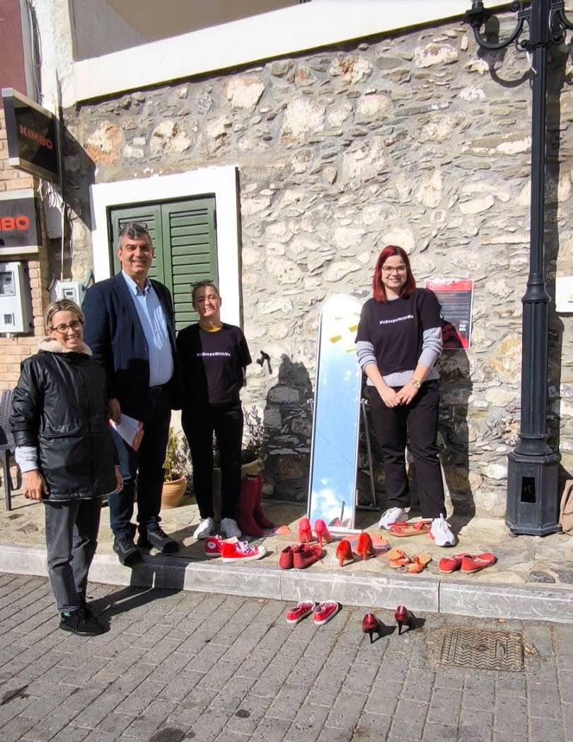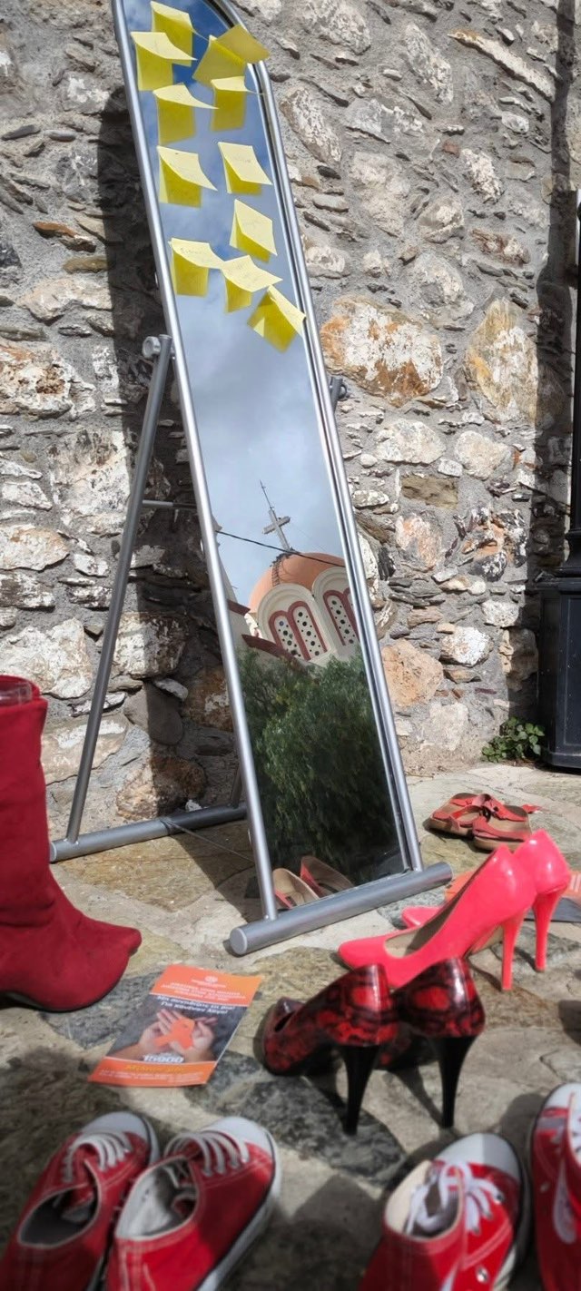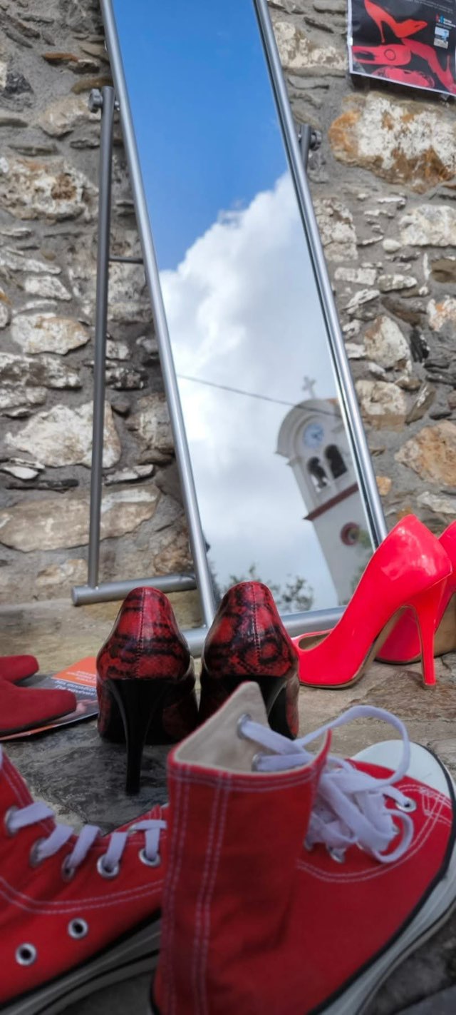 Εκεί παρουσιάστηκε μια εγκατάσταση με κόκκινα παπούτσια, τα οποία αντιπροσωπεύουν τις γυναίκες, θύματα έμφυλης και ενδοοικογενειακής βίας. Δίπλα τους, ένας καθρέπτης που αποτυπώνει τον συμβολισμό της απώλειας της ταυτότητας, της αυτοεκτίμησης και της προσωπικής ελευθερίας, που συχνά συνοδεύει τη χρόνια κακοποίηση.